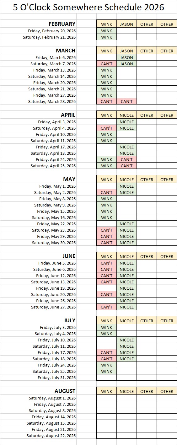 5 O'ClockSomewhere - Weekly Karaoke Schedule